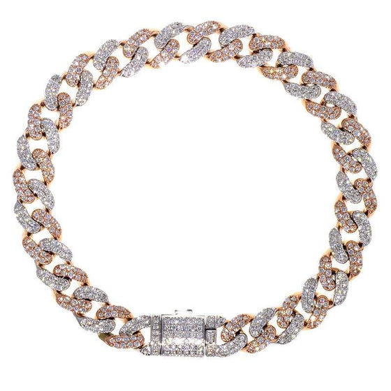 The slick looking Miami Cuban Two-Tone Diamond Bracelet is packed with approximately 5ctw and beautifully set in 10K White and Rose Gold setting. This bracelet is secured with a custom diamond snap lock that completes the look once snapped closed. Total Diamond Carat...- $6,895.00
