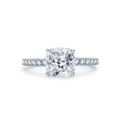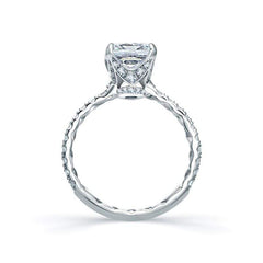 The Quilted French Pave Cushion Cut Center engagement ring from the Art Deco collection flaunts an intricately diamond adorned band, as well as pavé diamond prongs for added brilliance. The band includes French pavé, a setting featuring a small V-shaped dip beneath the diamonds to allow more light to hit the sides, thus increasing the stones’ sparkle, while the band’s luxurious quilted interior ensures a perfect fit and a well-balanced center diamond.