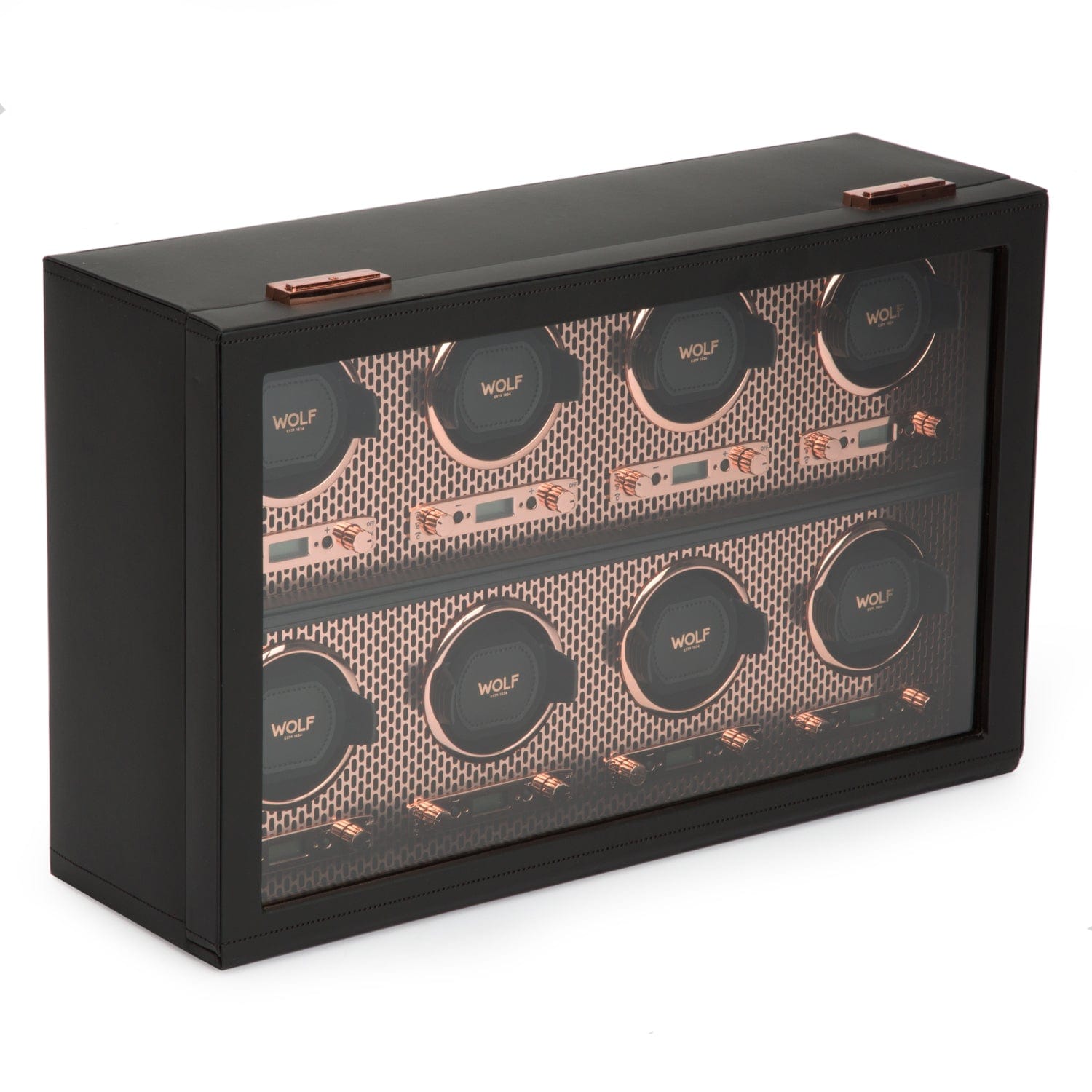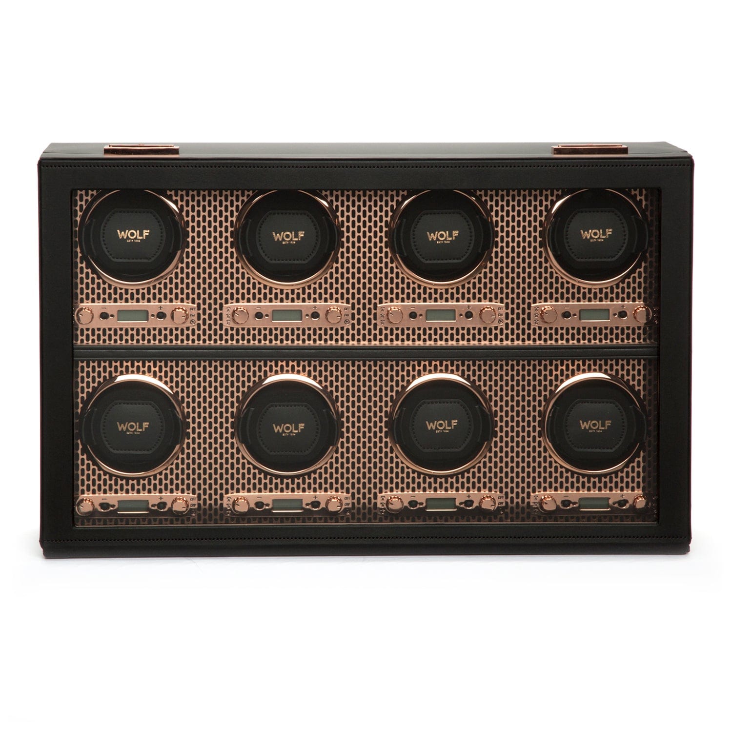 Powder-coated and copper plated laser cut perforated steel melded with clean, sleek lines. AXIS drives a modern, bold look for safekeeping your timepieces. Our patented technology of counting rotations of the axis of your watch guarantees precise turns per day. Bold luxury, faultless design, take AXIS for a spin.