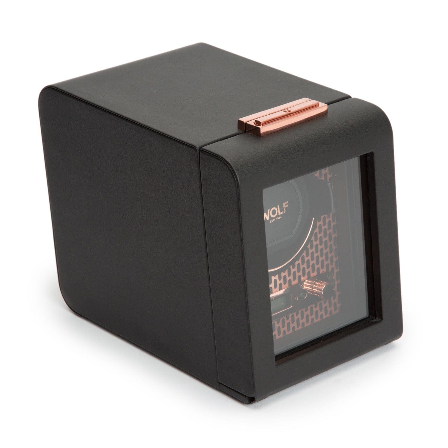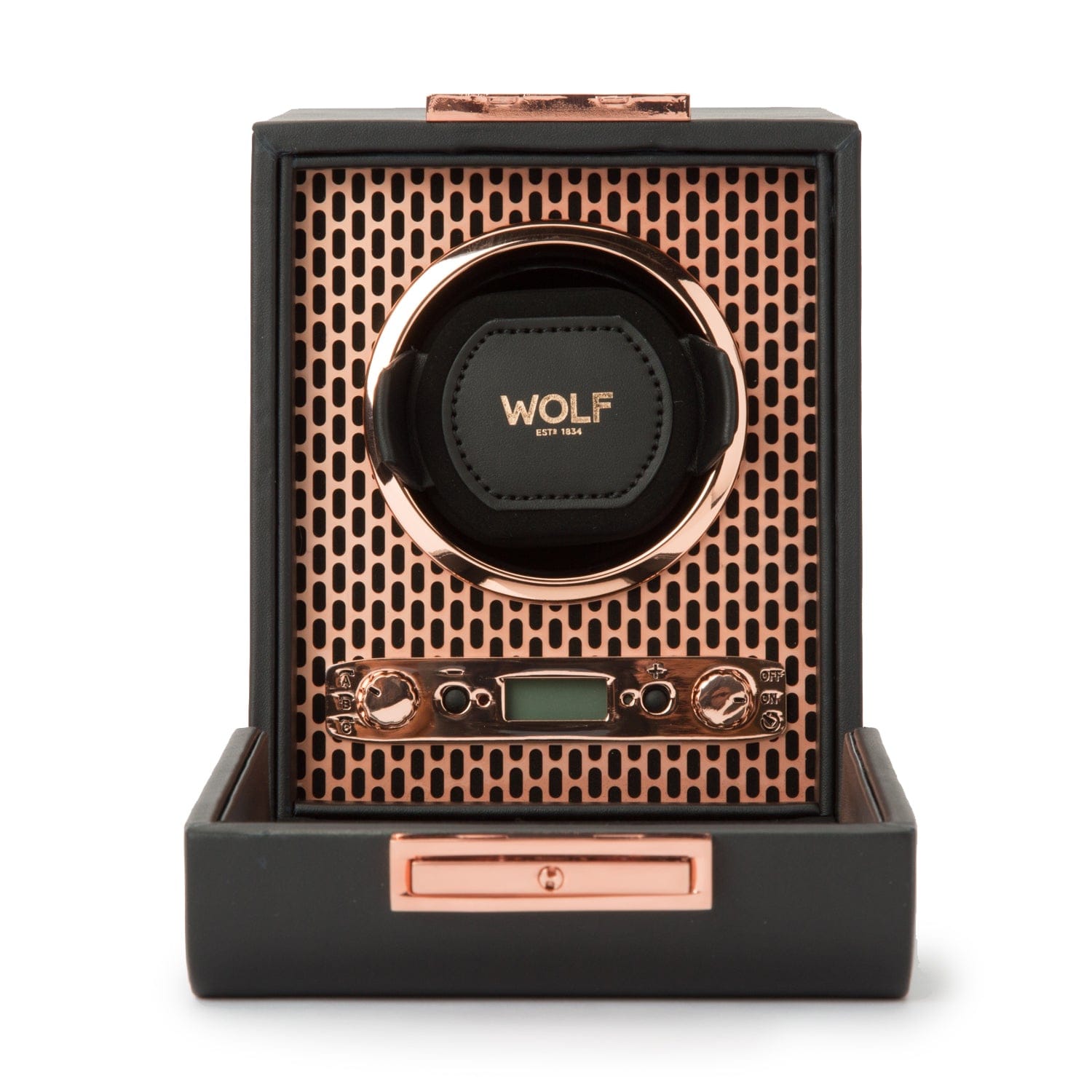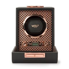 Powder-coated and copper plated laser cut perforated steel melded with clean, sleek lines. AXIS drives a modern, bold look for safekeeping your timepieces. Our patented technology of counting rotations of the axis of your watch guarantees precise turns per day. Bold luxury, faultless design, take AXIS for a spin.