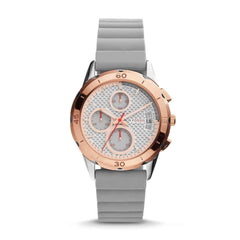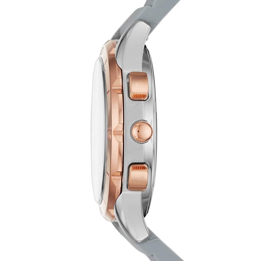 Rose gold tone stainless steel case with a iron silicone strap. Fixed bezel. White dial with rose gold-tone hands and index hour markers. Minute markers around the outer rim.