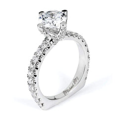 This immaculate Michael M engagement ring is displayed with a stunning round shaped center diamond (not included at time of purchase), and can fit an array of diamonds ranging in size from 1.25 carats to 1.75 carats. This Michael M engagement ring is immaculately adorned with over 0.86 carats total weight of breathtaking round cut side diamonds.