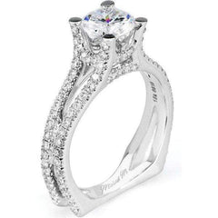 This immaculate Michael M engagement ring is displayed with a stunning round shaped center diamond (not included at time of purchase), and can fit an array of diamonds ranging in size from 0.90 carats to 1.10 carats. This Michael M engagement ring is immaculately adorned with over 1.10 carats total weight of breathtaking round cut side diamonds.