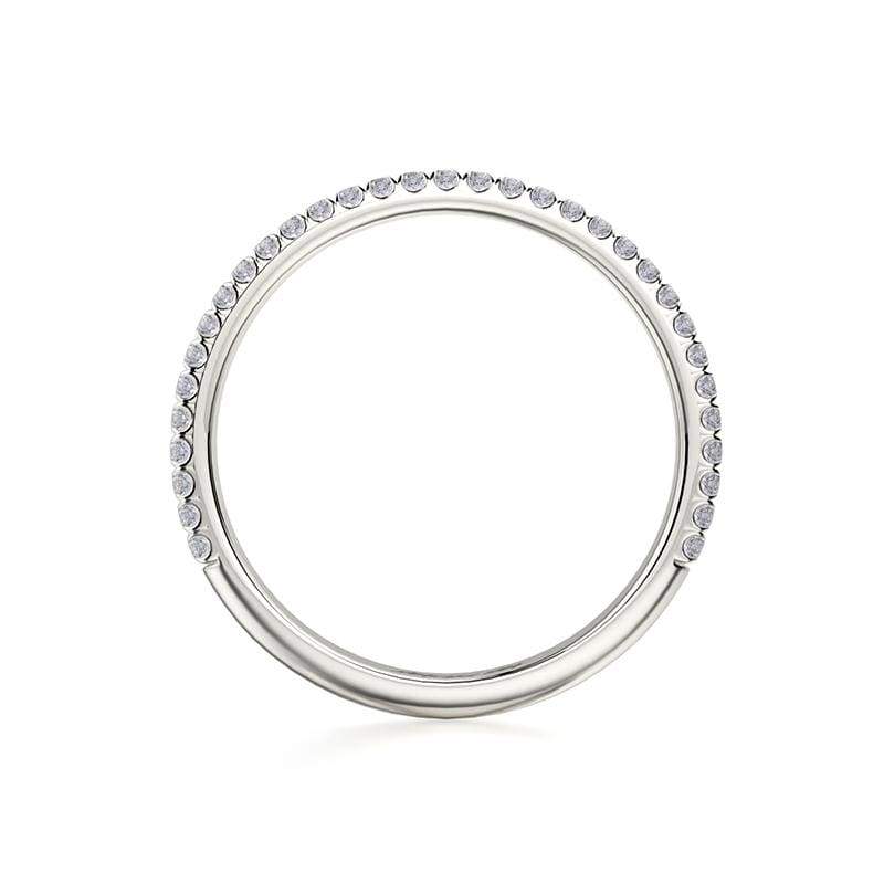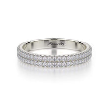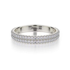 This Michael M ladies wedding band is adorned with brilliant round shaped prong set diamonds, and are placed in a beautiful 1/2 way ring style.