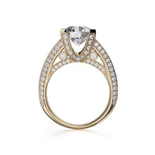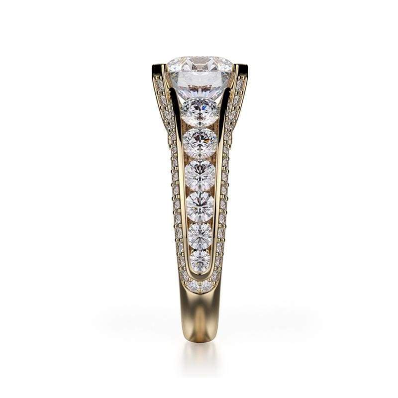 This immaculate Michael M engagement ring is displayed with a stunning round shaped center diamond (not included at time of purchase), and can fit an array of diamonds ranging in size from 1.85 carats to 2.10 carats. This Michael M engagement ring is immaculately adorned with over 1.90 carats total weight of breathtaking round cut side diamonds.