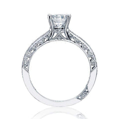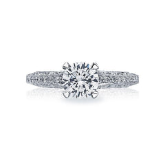 Diamond crescent silhouettes decorate the sides of the band, while brilliant round diamonds taper along the ceiling for stylish flair. Tacori details make this ring captivating from every angle.