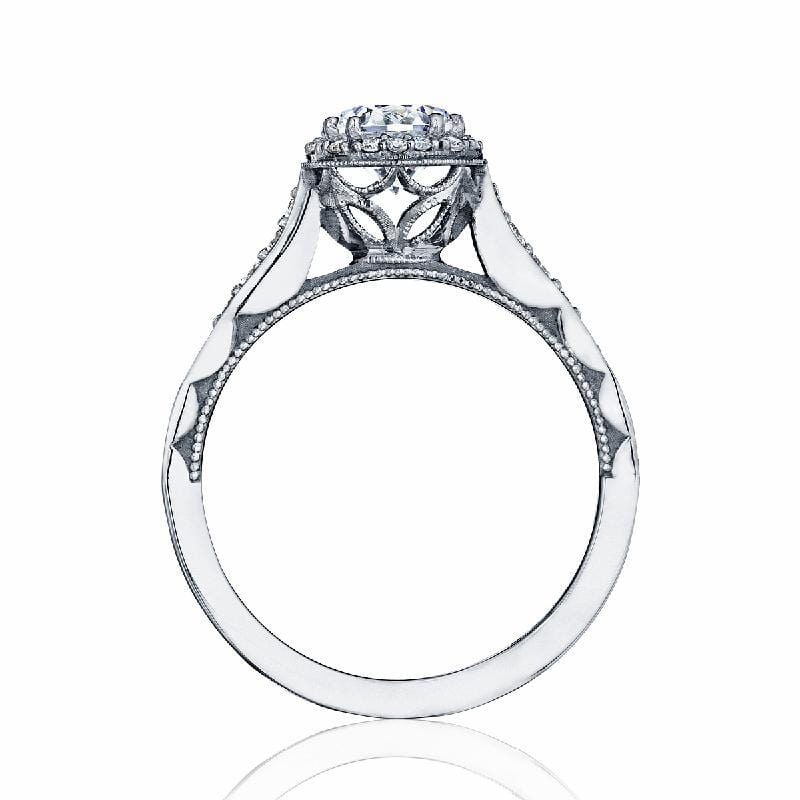 A ribbon style band and pavé diamond bloom give this ring 360 degrees of sparkle. A round diamond sits pretty at the center of this Tacori design.