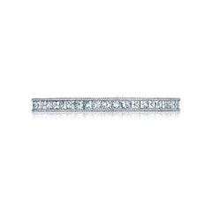 A single, pure row of bright channel set princess cut diamonds link in an eternal circle, with lace-like crescents and milgrain detail on both sides.