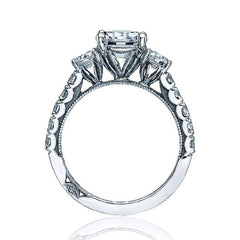 This Tacori Clean Crescent three stone engagement ring setting is beautiful. The three stone setting offers you approximately 0.75cts of round cut diamonds which accent your desired center stone. Along the profile view of this ring, you will see the clean crescent details which are iconic to Tacori. Also in the profile view, you will see the handcrafted milgrain details that travel half way down the band.